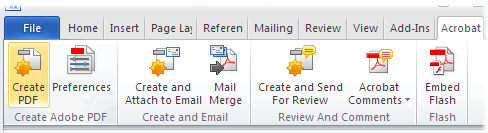 Kuvakaappaus Word 2010 Acrobat valintanauha, jolta Create PDF on valittuna.