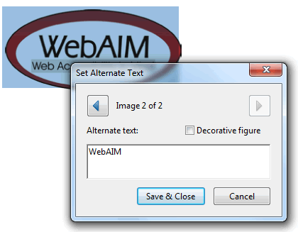 Kuvakaappaus WebAIM-logo valittuna ja Arobat XIn Set Alternate Text -ruudussa teksti WebAIM.