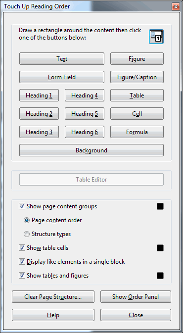 Kuvakaappaus Touch Up Reading Order -ikkunasta.