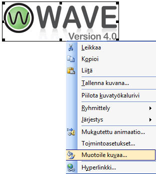 Kuvakaappaus Word 2003 kuvankäsittelystä valittuna Muotoile kuvaa.