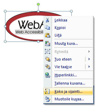 Kuvakaappaus Word 2007 kuvankäsittelystä valittuna koon muokkaaminen