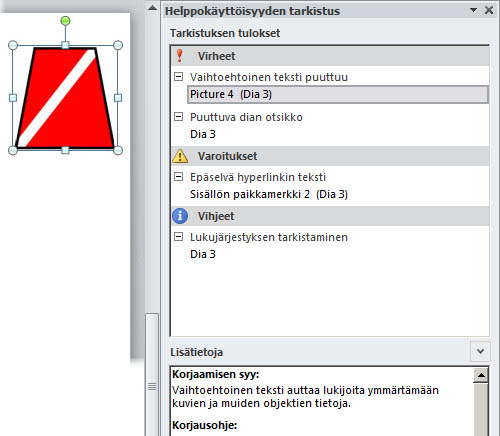 Kuvakaappaus PowerPoint 2010 helppokäyttöisyyden tarkistuksen tulokset.