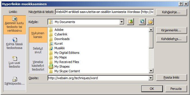 Kuvakaappaus hyperlinkin muokkausikkunasta