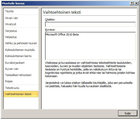 Kuvakaappaus, jossa on tekstivastine lisätty Vaihtoehtonen teksti-ikkunan Kuvaus-riville