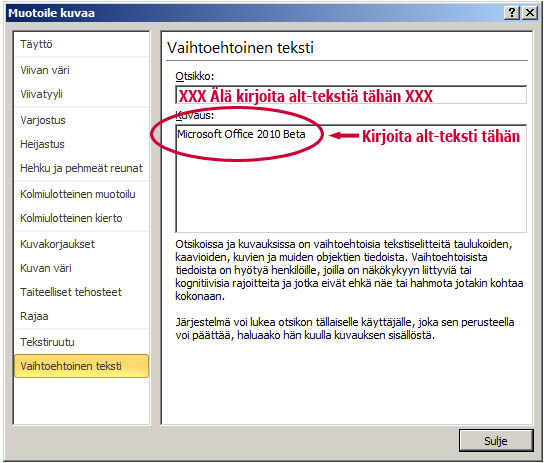 Kuvakaappaus, jossa on tekstivastine lisätty Vaihtoehtonen teksti-ikkunan Kuvaus-riville.